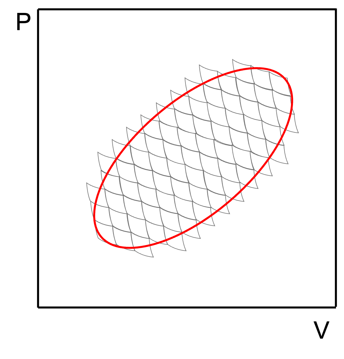 위의 식은 카르노 사이클의 엔트로피 변화량이 $ \Delta S = 0 $ 라는 사실과 같은 결과이다. 아래 그림과 같이 어떤 폐순환 경로가 있다고 가정하자. 이 경로는 아래 그림처럼 무한히 작고 무수히 많은 카르노 사이클들의 합과 같다고 할 수 있다.